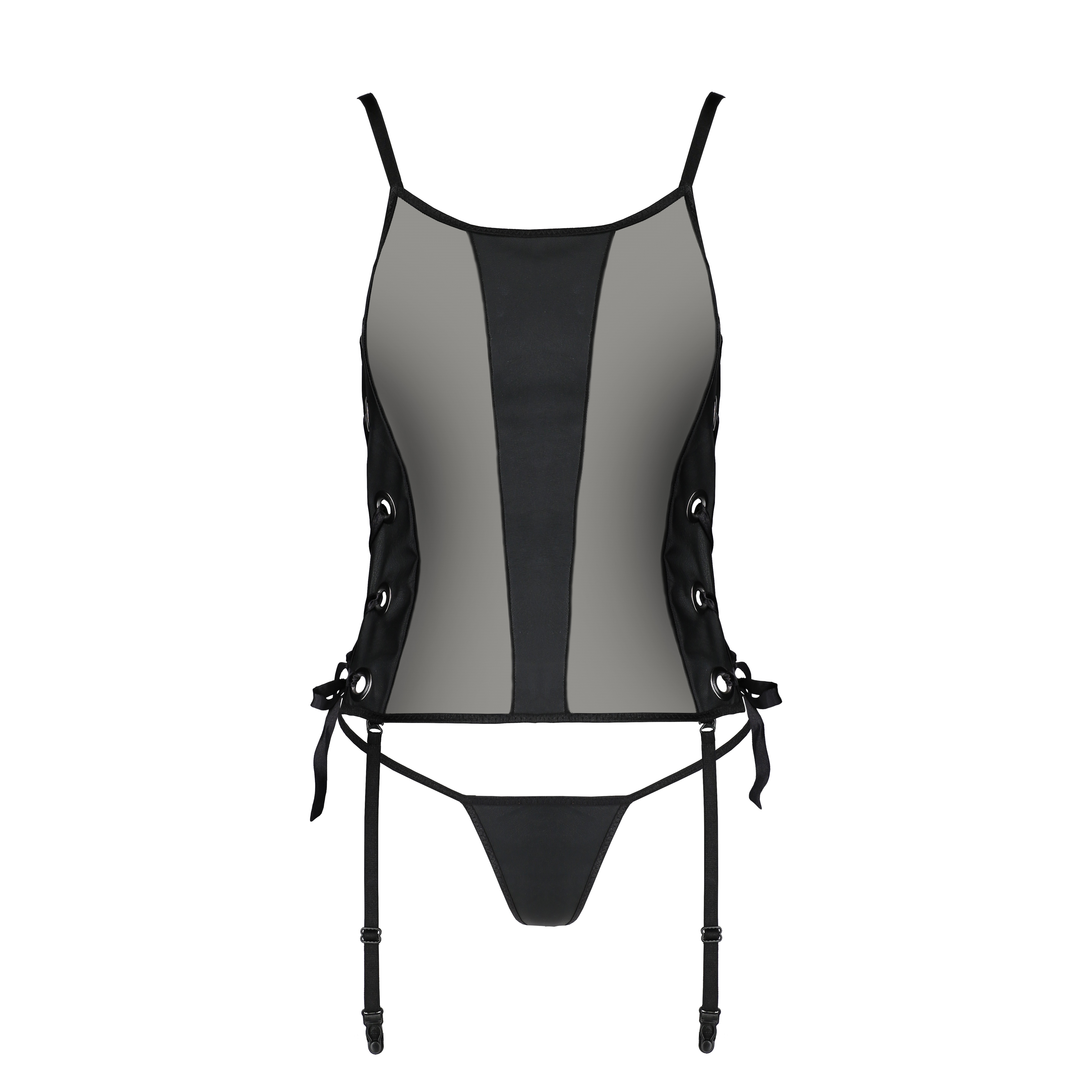 Il corsetto Malwia unisce eleganza e audacia, con tulle nero e fianchi aperti regolabili con un nastro di raso. Include un perizoma coordinato per un tocco di raffinatezza e seduzione.