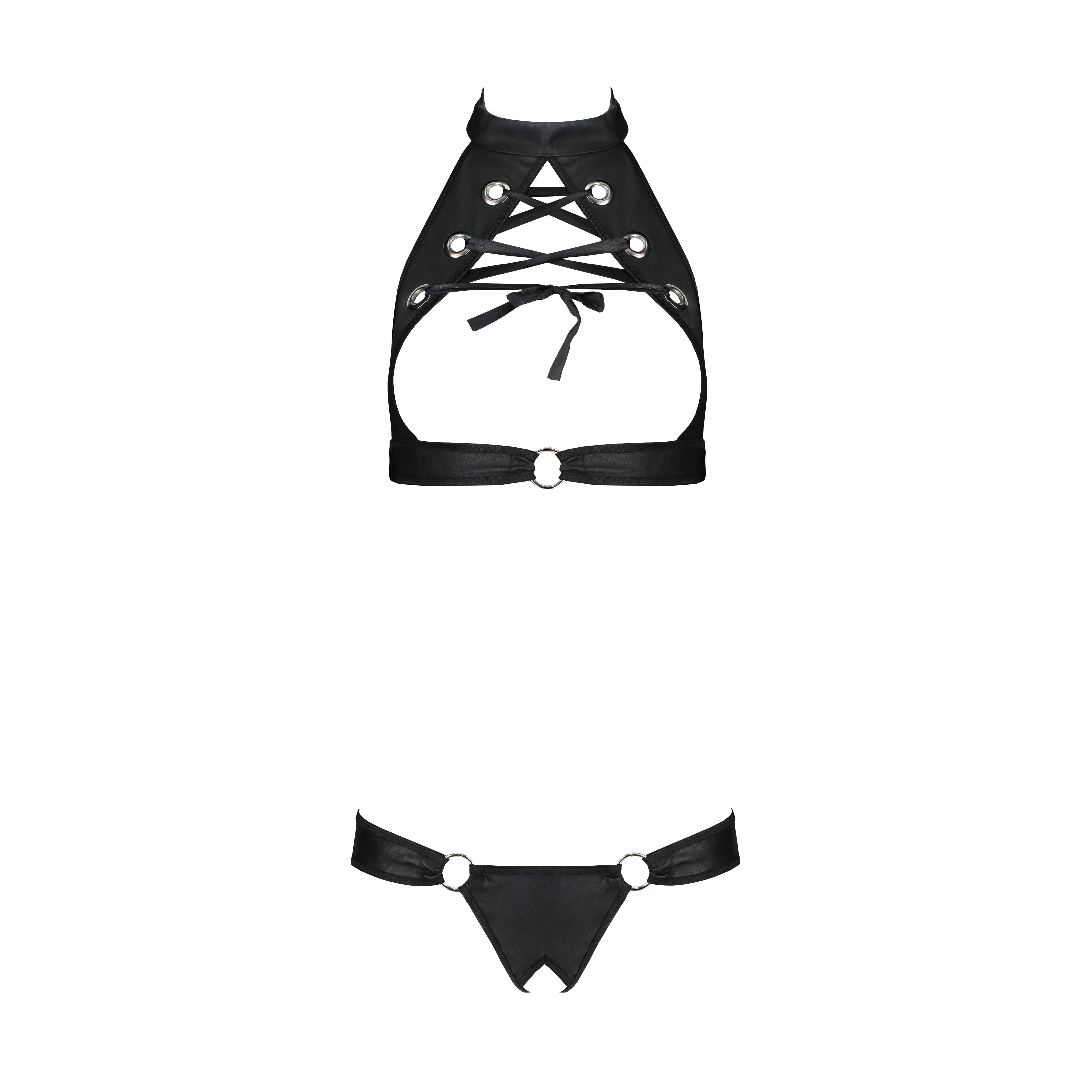 Il perizoma, abbinato al top, ha un'apertura tra le gambe ed è ornato da due anelli dorati che ne intensificano la sensualità. Sul retro, l'audace cut-out aggiunge un tocco sexy e seducente.
