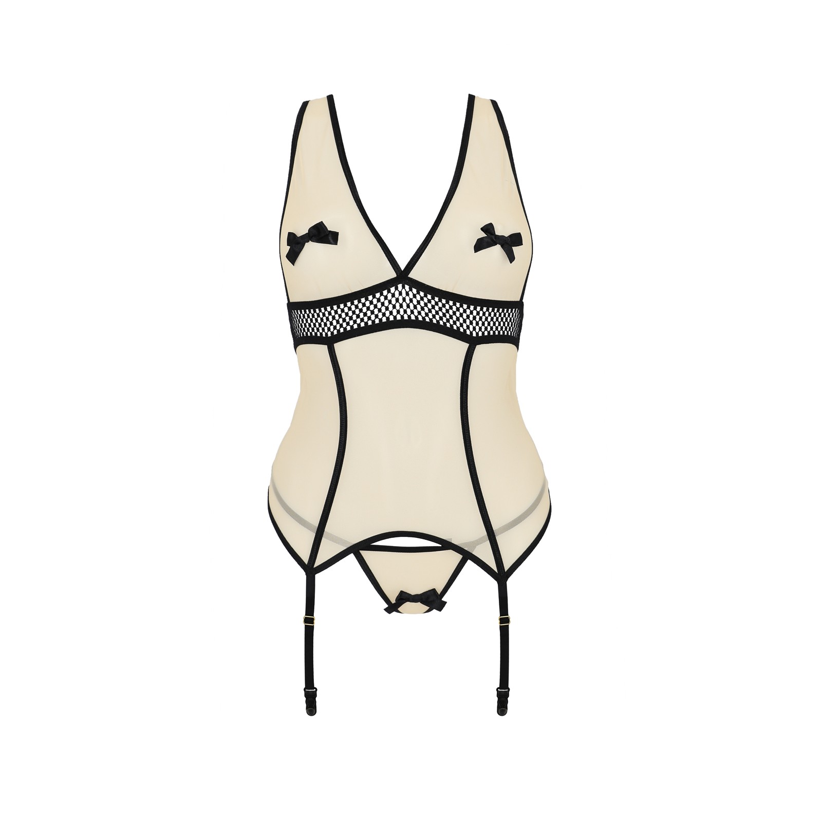 Seducente corsetto che modella perfettamente la vita e il busto. Inserti a forma di fiocco estremamente romantici e tulle delicato. Una combinazione perfetta che accenderà i vostri sensi.