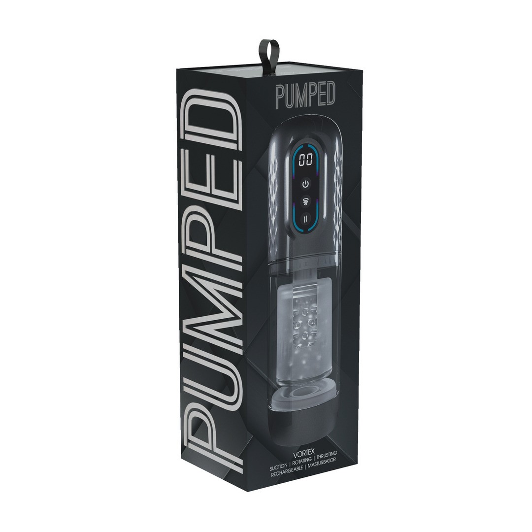 Masturbatore Vortex con guaina morbida, potente suzione e funzione di rotazione interna.