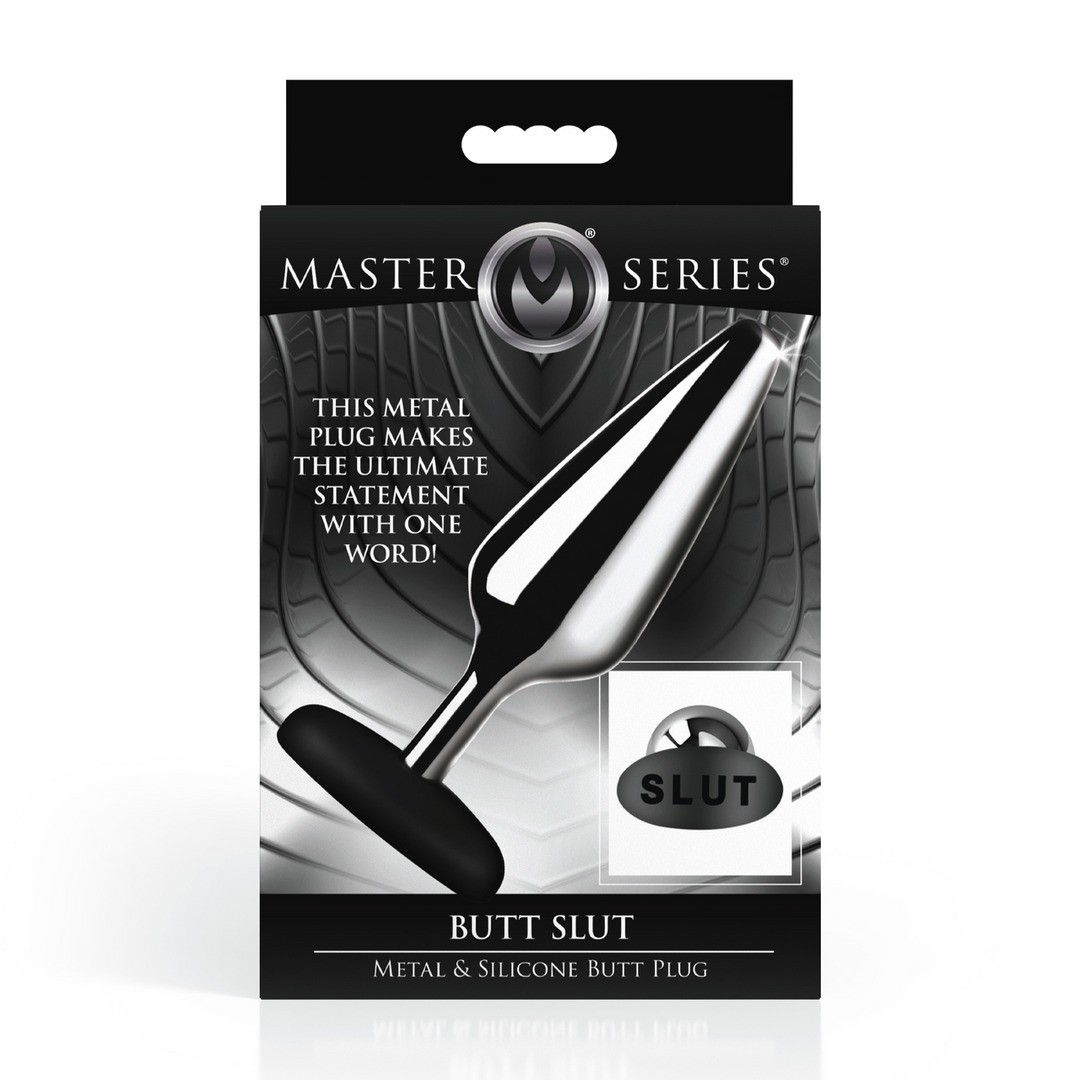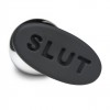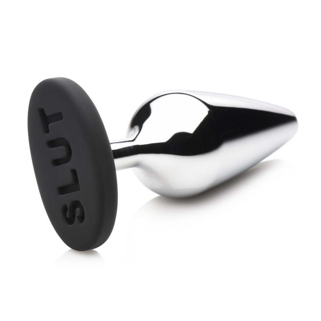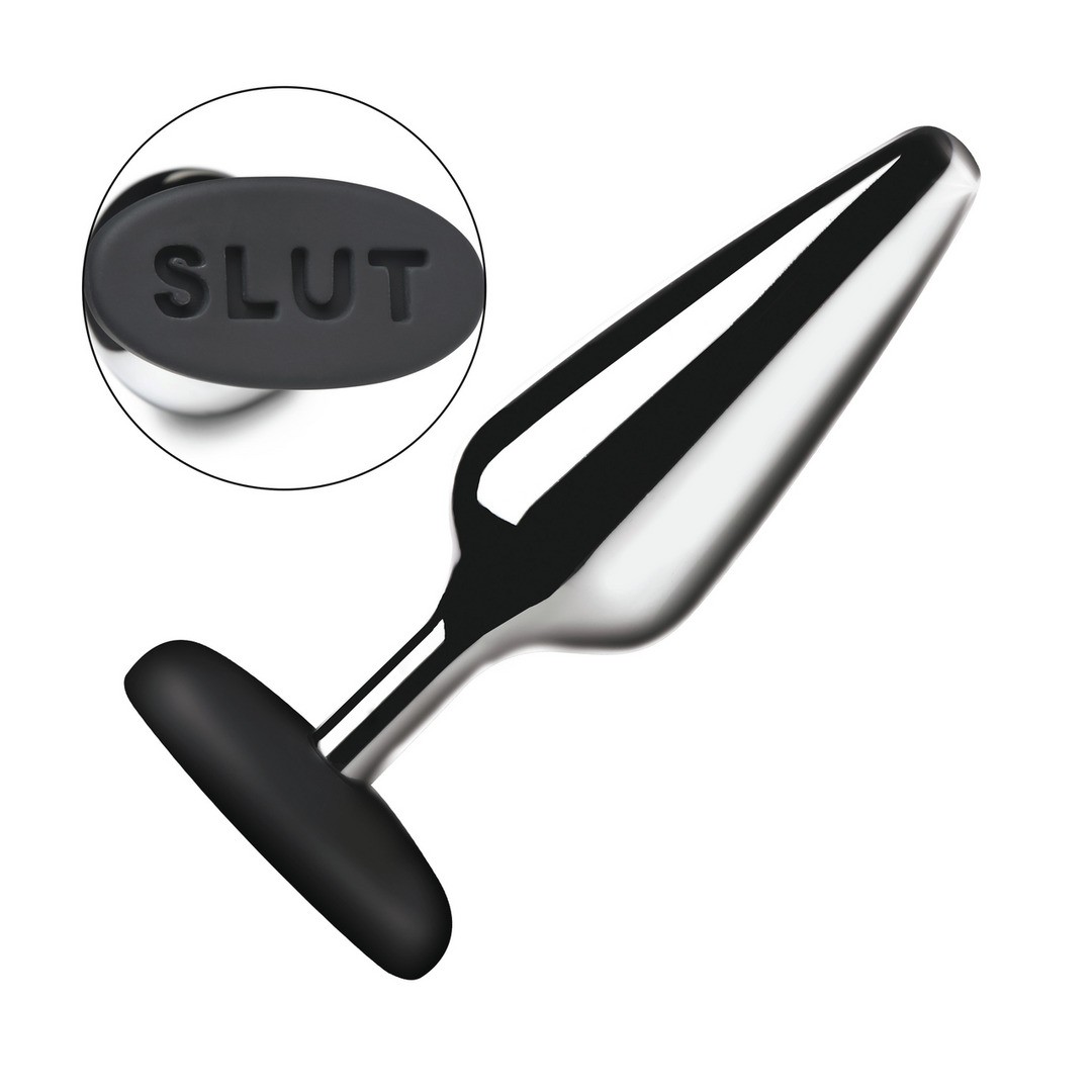 Plug anale in metallo con base in silicone e scritta SLUT, perfetto per giochi audaci ed eccitanti.