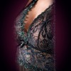 Uma camisa de noite muito elegante, fabricada em malha preta translúcida, com copas em renda e uma faixa abaixo do busto, também ela em renda com detalhes em prateado e verde metalizado. Entre as copas possui um encantador laço de cetim preto, e ata no pescoço. Inclui tanga a combinar. É um produto de alta qualidade da Chilirose, apresentado numa elegante caixa.