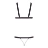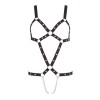 Body de tiras preto, confecionado em faixas elásticas revestidas a tecido com tachas, que envolvem o corpo de forma ousada e sedutora. As duas correntes metálicas amovíveis passam pela zona da virilha, acrescentando um toque final provocador e cheio de atitude ao conjunto.