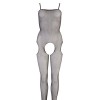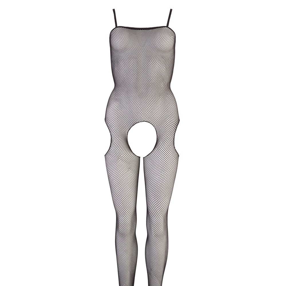 Catsuit em rede preta elástica, com grandes aberturas laterais que criam um visual ousado e provocador. Com alças finas, sem entrepernas e com pés integrados, adapta-se ao corpo com conforto e liberdade de movimentos.