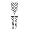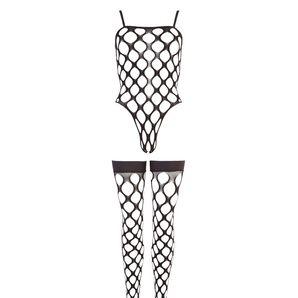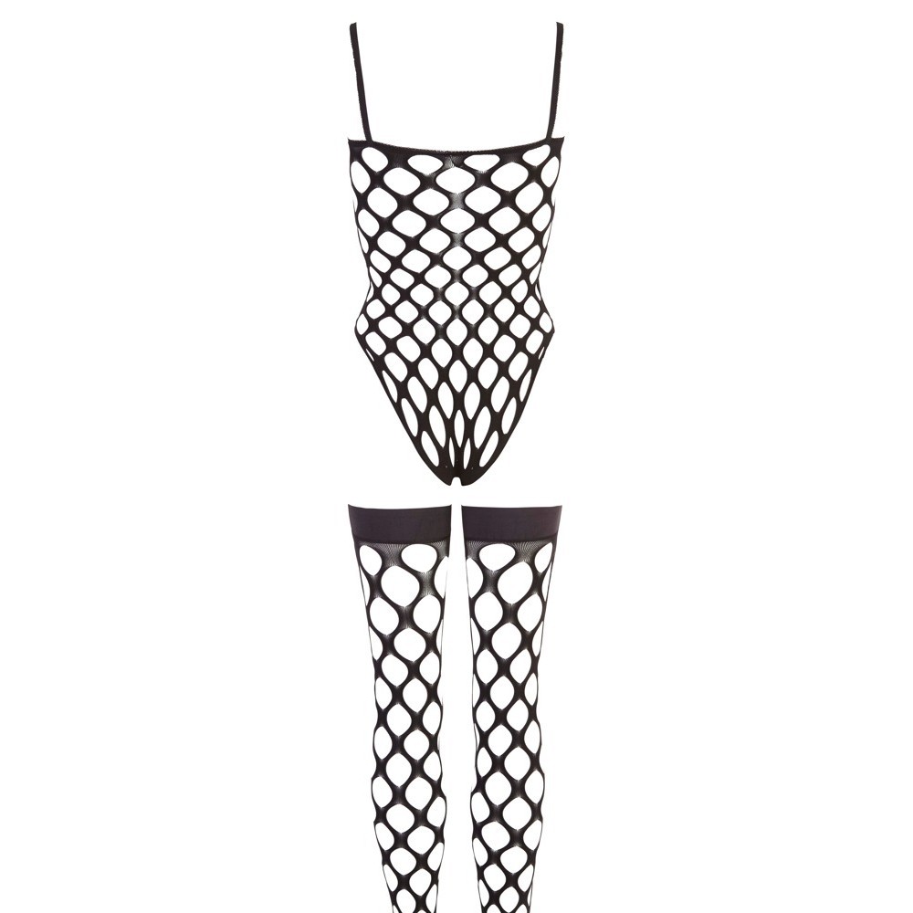 Conjunto composto por body e meias de ligas, totalmente confecionado em rede preta, macia e elástica, sem costuras para um conforto absoluto. As meias incluem uma faixa com forro de silicone, garantindo um ajuste seguro e antiderrapante. Um conjunto sensual que envolve o corpo de forma perfeita.