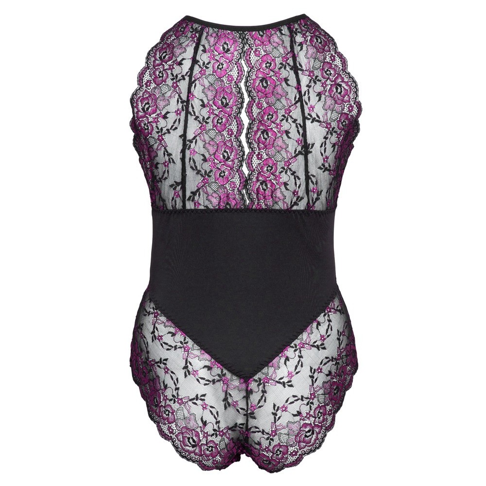 Body transparente da Cottelli CURVES em renda floral de duas cores, com uma inserção opaca à volta da cintura. Apresenta um grande recorte na frente e nas costas, fecho de correr no decote frontal e a parte da tanga pode ser aberta de forma erótica graças aos botões de pressão na virilha.
