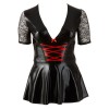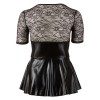 Material: 92% poliéster, 8% spandex; renda: 90% poliamida, 10% elastano.