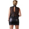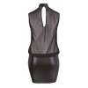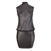Minivestido preto leve e solto, com parte superior transparente e sem mangas que realça a silhueta. Pequeno recorte nas costas e gola subida com dois botões, contrastando com a saia opaca e justa que destaca as curvas femininas.