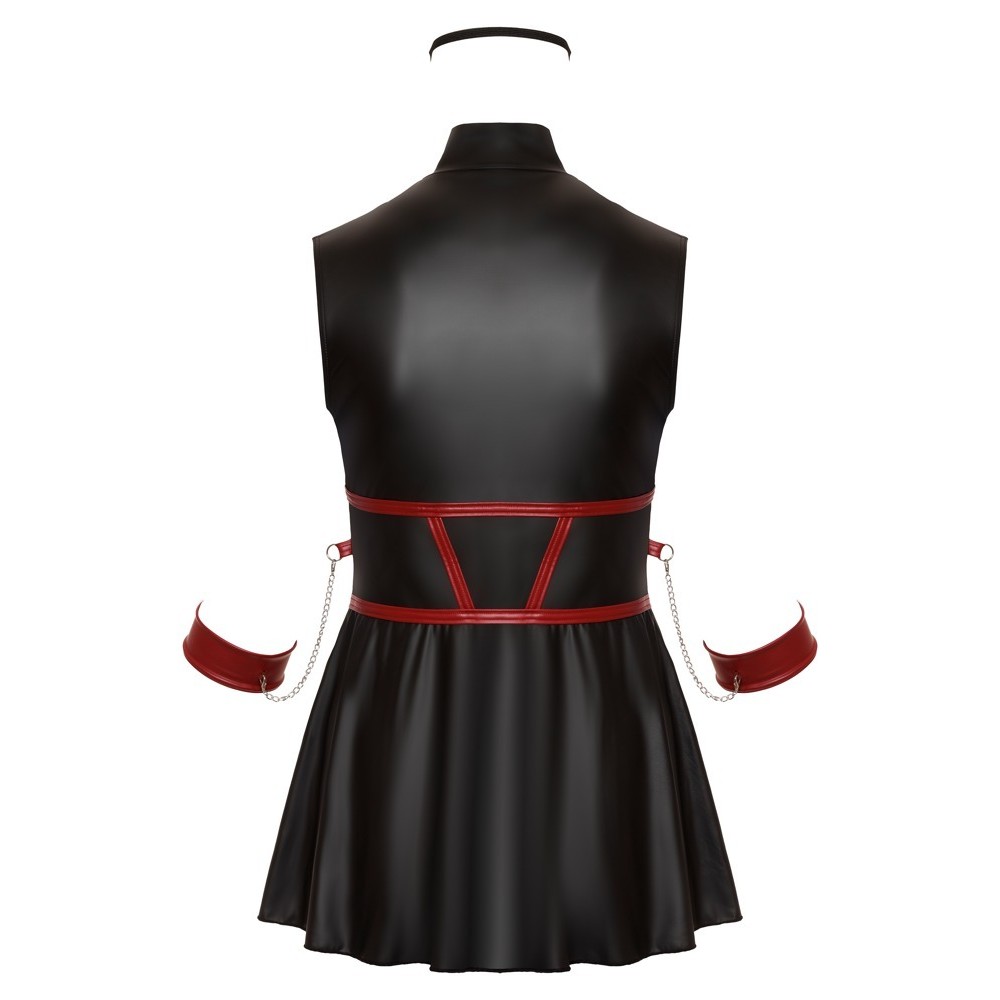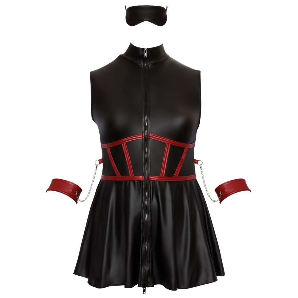Vestido curto sem mangas da Cottelli BONDAGE PLUS, com corte justo e saia ligeiramente rodada. Confeccionado em material elástico de elegante aspeto preto mate, com riscas vermelhas contrastantes no corpete que realçam a cintura. Na frente, possui um fecho de correr de duas vias em todo o comprimento, que pode ser aberto tanto a partir da gola alta como da bainha. Em cada lado encontra-se uma argola para fixar as algemas macias incluídas, equipadas com correntes e ganchos de pressão. As algemas são ajustáveis graças aos fechos de gancho e argola. O conjunto inclui ainda uma máscara para os olhos, ligeiramente almofadada e totalmente opaca, perfeita para momentos de jogo e sedução.