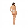 Teddy de rede em haltere com acabamentos em renda elástica. Costas baixas com abertura de fecho de argola dourada e pormenor de adorno de pérolas drapeadas. Decote profundo e costas em fio-dental.