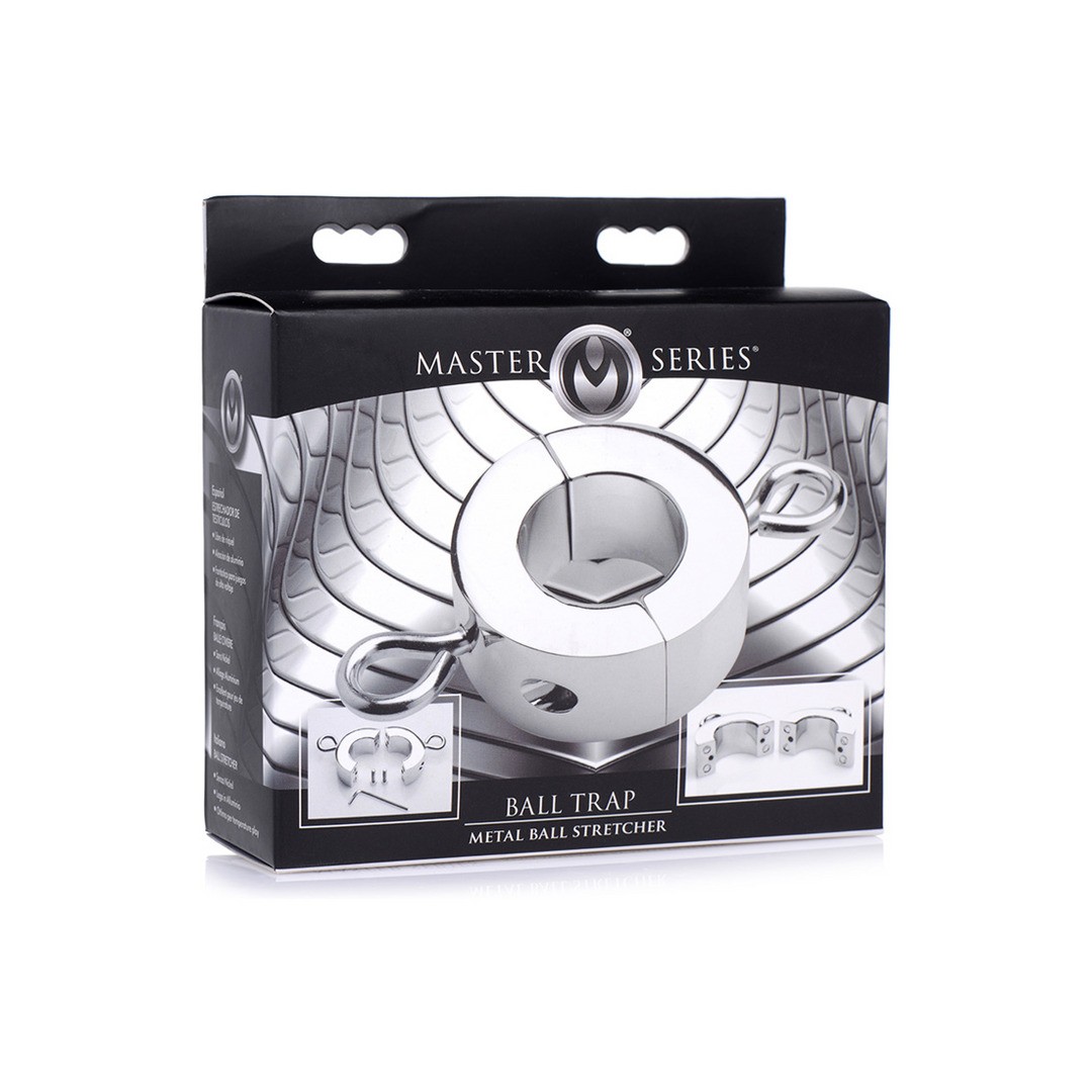 O Ball Trap é um esticador de bolas em metal, ideal para os amantes de BDSM que apreciam jogos de estimulação testicular. Com um peso de 220 gramas, foi concebido para puxar suavemente o saco escrotal, proporcionando uma sensação intensa e única. O anel possui dois pontos de fixação que permitem adicionar pesos ou acessórios, tornando-o a base perfeita para criar diferentes cenários durante a cena. Castigue o seu submisso pelo mau comportamento com pesos adicionais ou prenda correntes às algemas dos tornozelos para o forçar a ajoelhar-se.