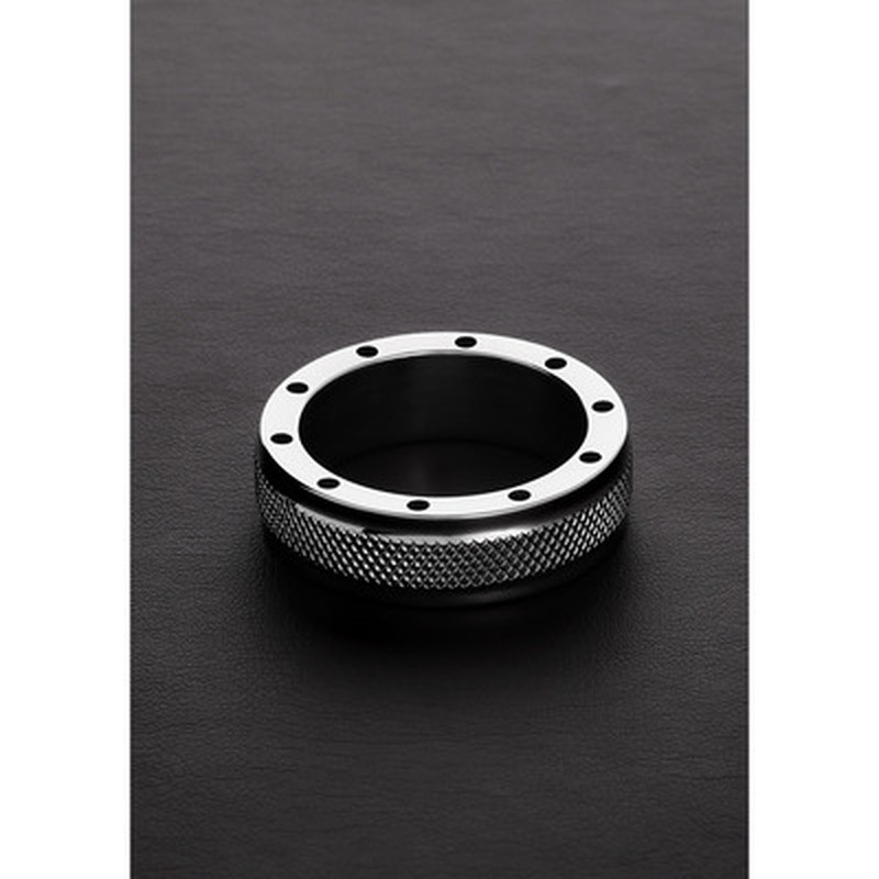 Anel para o pénis serrilhado em aço inoxidável, 5,5 cm x 1,5 cm, com 11 orifícios de ventilação para prazer intenso.