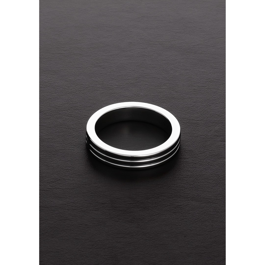 Anel para o pénis em aço inoxidável sólido com acabamento estriado. Este anel ajuda a prolongar a ereção e, simultaneamente, acrescenta intensidade extra durante a utilização.
