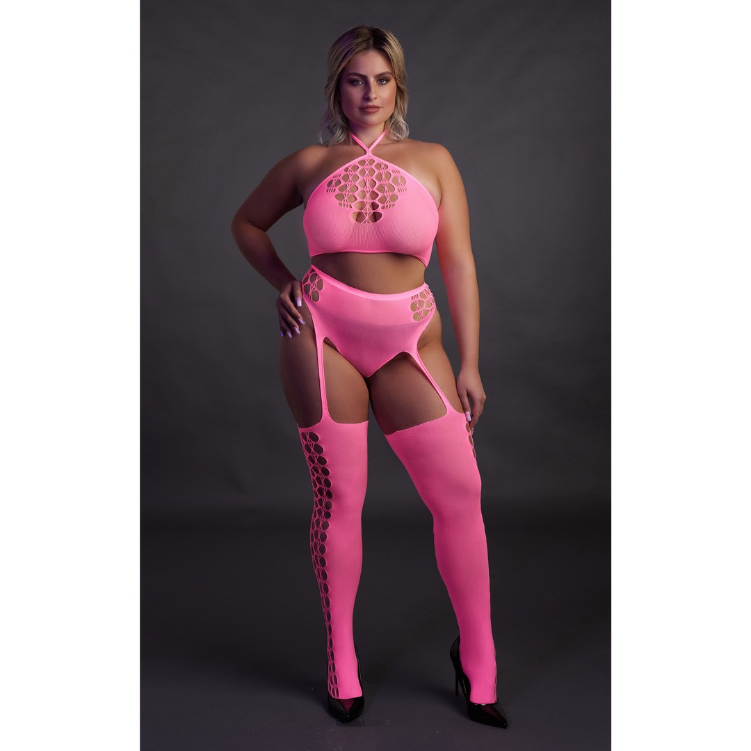 Conjunto Néon UV de duas peças com top curto e meias de ligas — sensual, vibrante e feito para brilhar à luz UV.