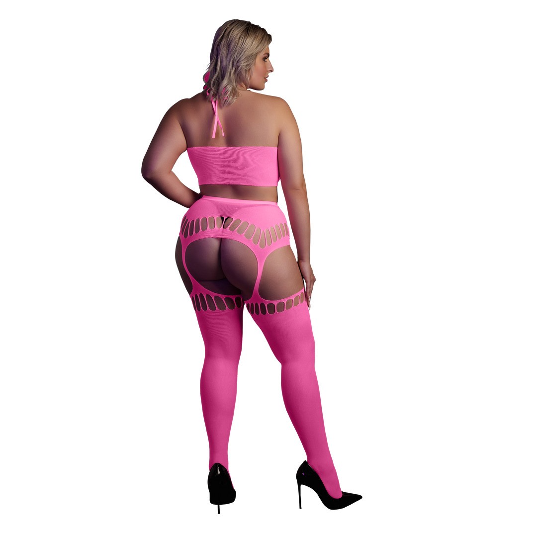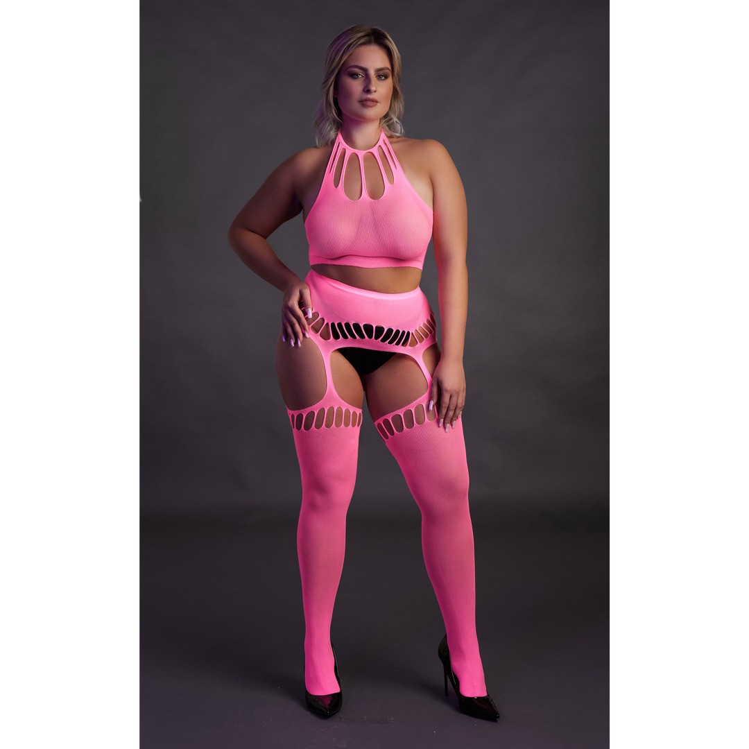 Conjunto Neon UV com top halterneck e meias de ligas — sensual, vibrante e feito para brilhar quando as luzes se apagam.