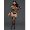 Catsuit com body em renda floral e rede, de tamanho Queen Size, com gola alta, ombros abertos e mangas 3/4. As meias de ligas integradas complementam o design elegante e extremamente sedutor, realçando a silhueta feminina. Ideal para quem procura uma peça de lingerie ousada e sofisticada.
