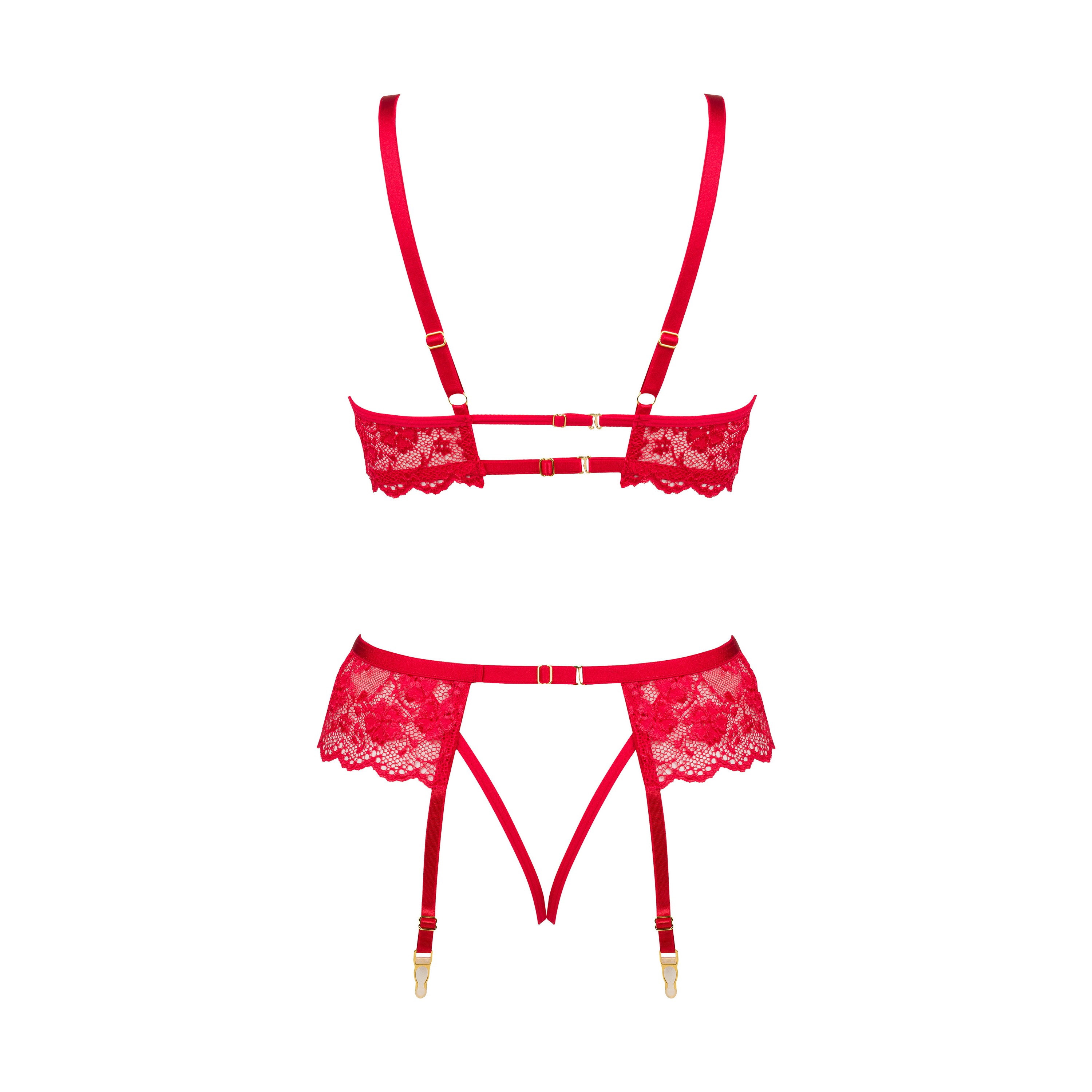 O Rose Set Red personifica a elegância e a sofisticação. A delicada renda que adorna o sutiã e a tanga complementa na perfeição os materiais transparentes e leves que abraçam suavemente o corpo. Este conjunto adapta-se perfeitamente à silhueta, exibindo os seus atributos da forma mais refinada. As alças e os fechos ajustáveis garantem um ajuste perfeito e conforto para usar durante todo o dia e à noite.