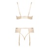 Um conjunto de lingerie clássico em cor nude, composto por um sutiã, cuecas e um cinto de ligas.