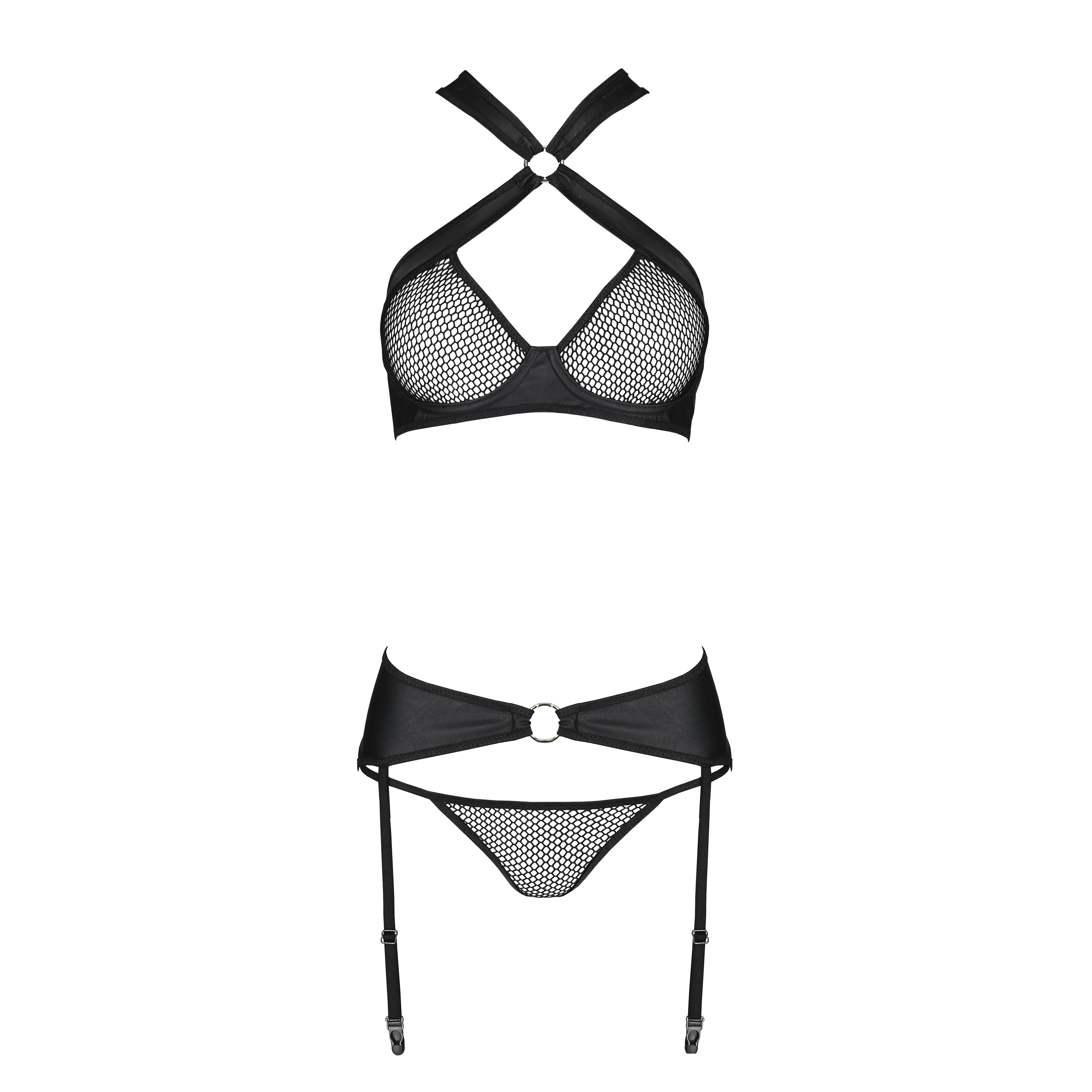 O conjunto Amanda combina elegância e sensualidade, com um sutiã de copas reforçadas, um cinto de ligas e uma tanga com elos dourados. Conforto e sofisticação assegurados.