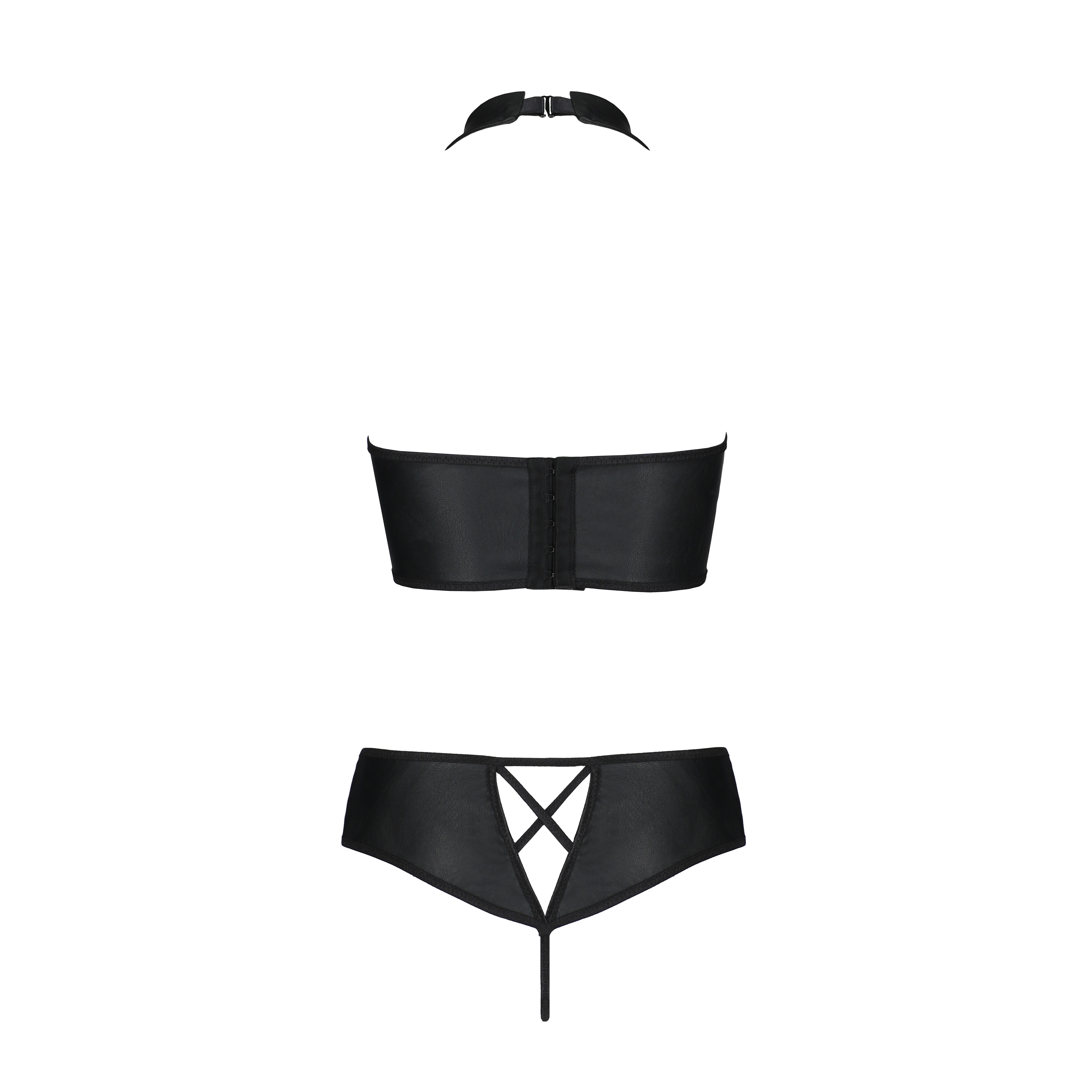 Este conjunto em pele é a verdadeira definição de sensualidade e sofisticação, com aplicações de tiras cruzadas que realçam as formas femininas de forma ousada e delicada.