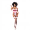 Fato sexy de enfermeira em malha às riscas com renda, tanga e touca, perfeito para seduzir.