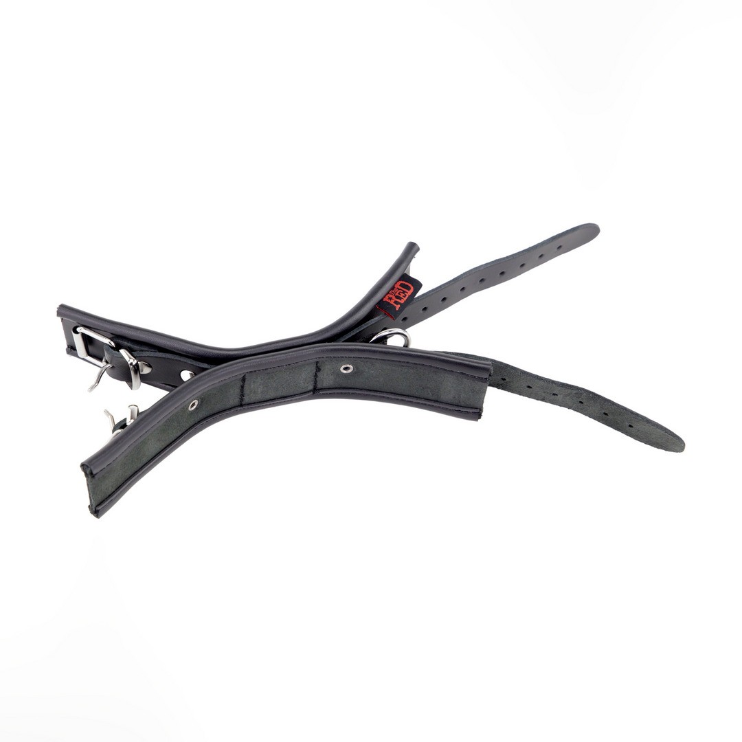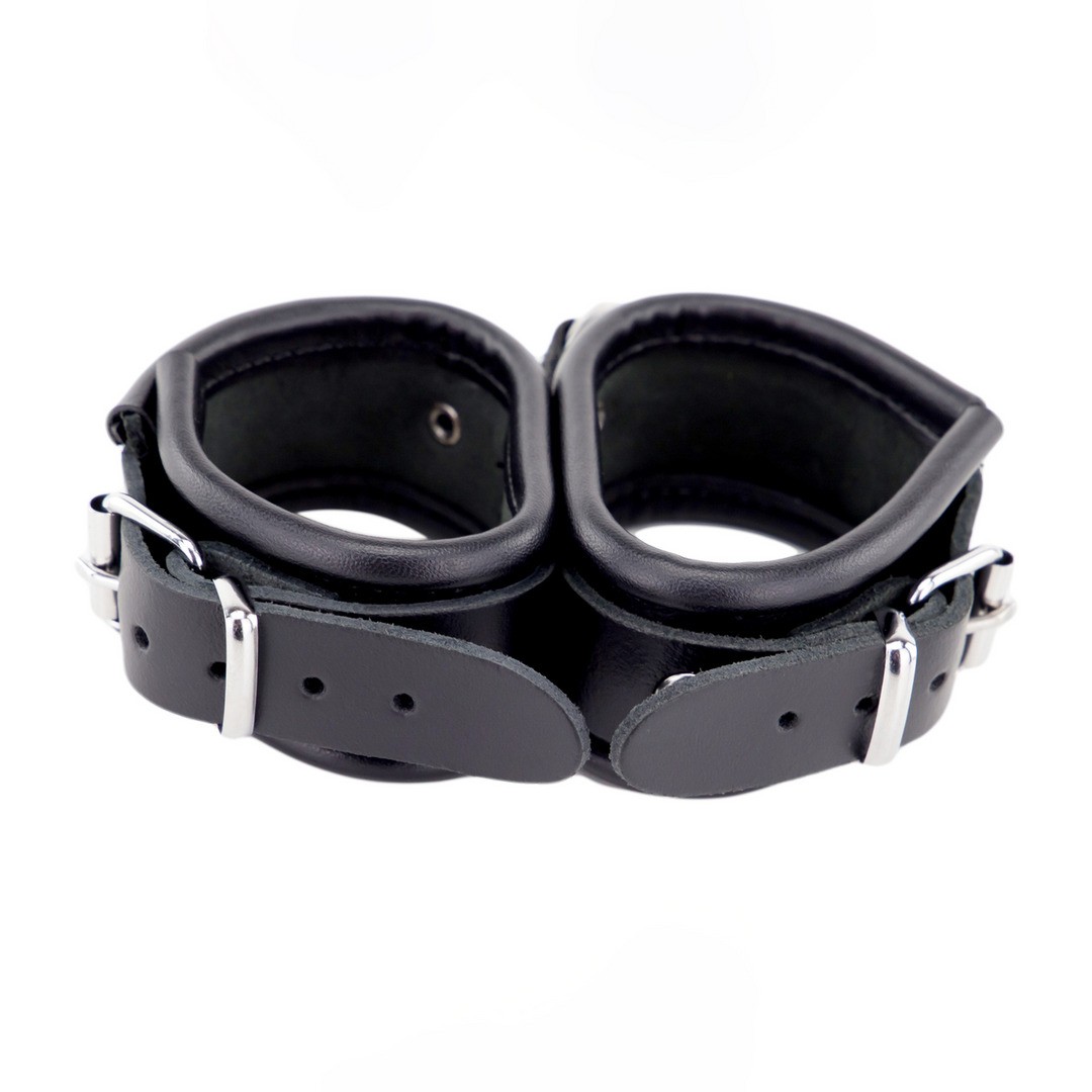 Algemas duplas em couro com tira em tecido e argola metálica, concebidas para oferecer controlo firme com conforto.