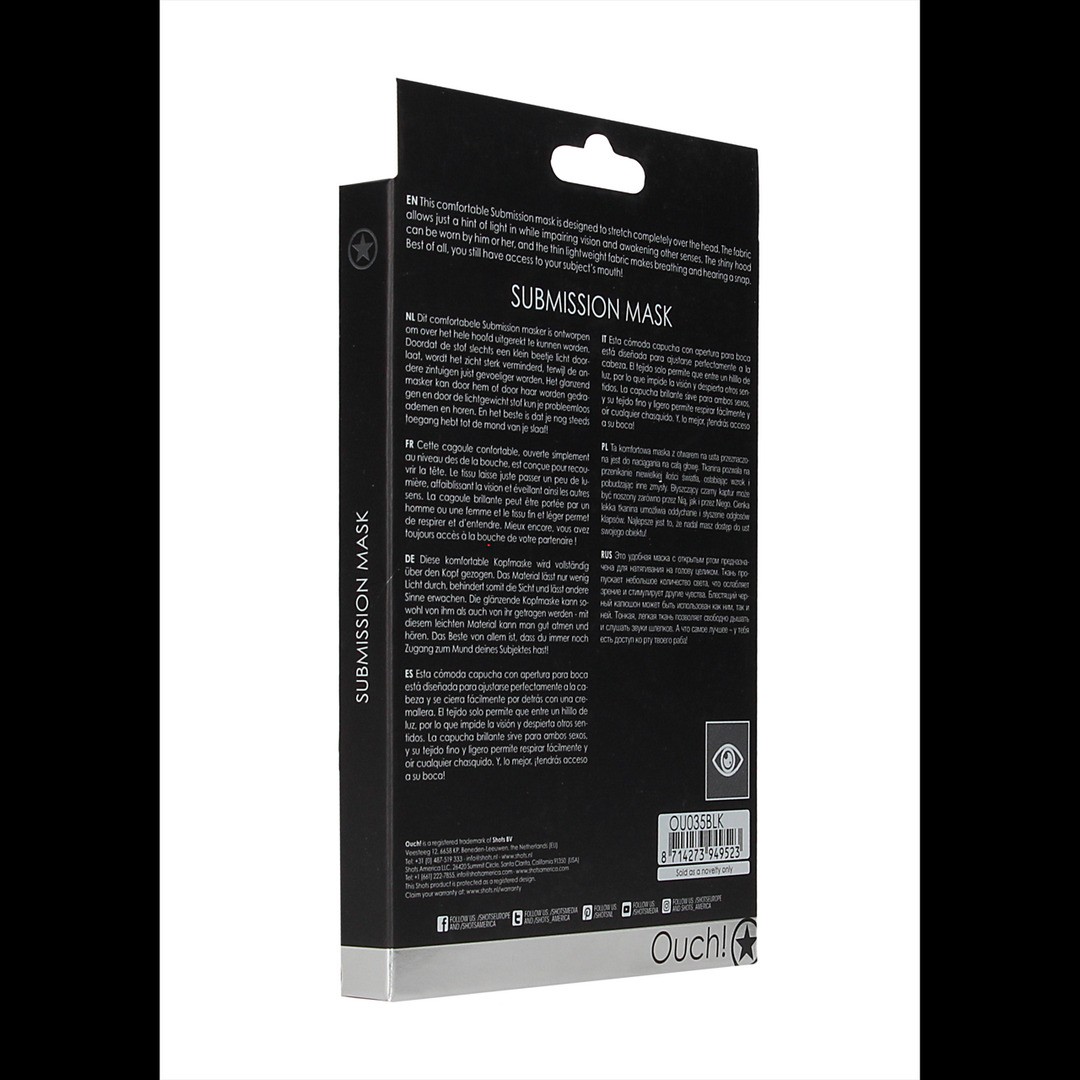 Esta confortável máscara de submissão foi criada para ajustar-se perfeitamente à cabeça e fecha-se facilmente na parte de trás graças ao fecho zíper. O tecido permite apenas que passe um pouco de luz, impedindo a visão, despertando outros sentidos. Esta máscara integral e brilhante pode ser usada por ele ou por ela, e o tecido fino e leve permite respirar e ouvir qualquer ruído por mais pequeno que seja. Esta máscara possui a zona da boca com uma abertura, assim terá acesso à boca do utilizador e depois… Basta usar a sua imaginação.