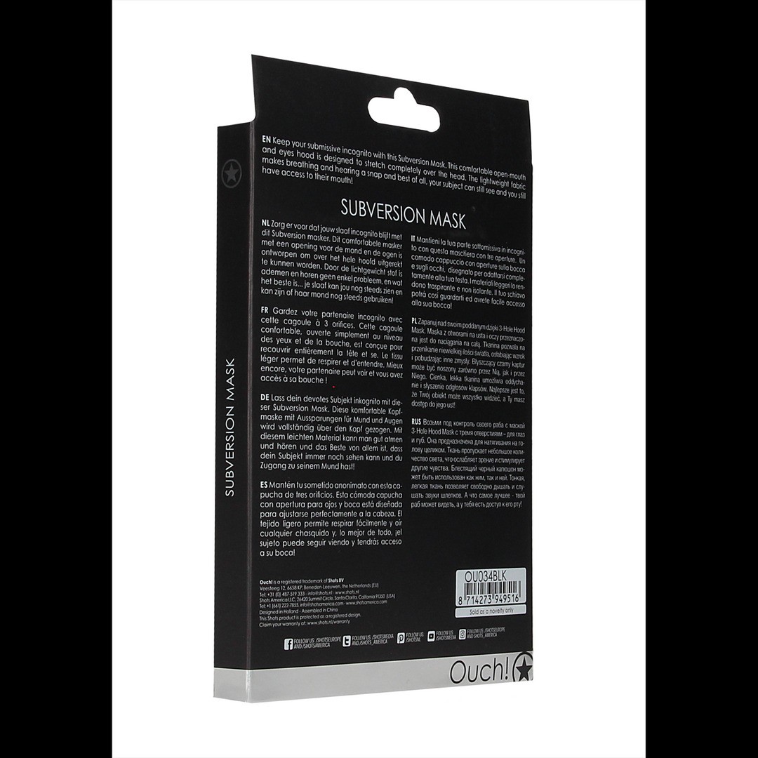 Mantenha o seu submissivo no anonimato com a máscara de subversão. Esta confortável máscara ajusta-se perfeitamente à cabeça e fecha-se facilmente na parte de trás graças ao fecho zíper.