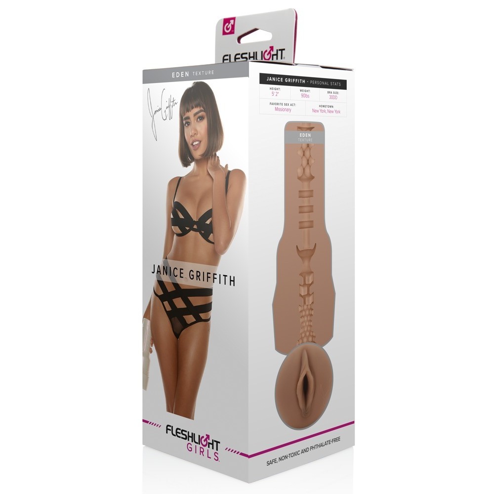 Мастурбатор Janice Griffith Eden от Fleshlight имеет дискретный дизайн в форме фонарика и включает в себя точную копию влагалища актрисы. Внутренняя часть мастурбатора имеет различную ширину, что приближает ощущения к ощущениям от узкой вагины, обеспечивая интенсивный и стимулирующий массаж во время использования. Мастурбатор изготовлен из сверхмягкого материала, похожего на кожу, и имеет автограф Дженис рядом с отверстием. Он съемный, что облегчает чистку.