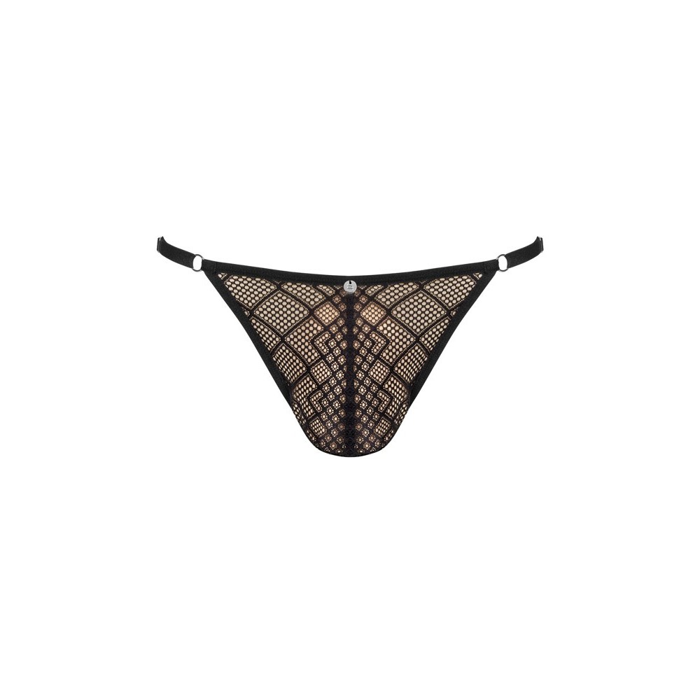 Черные стринги Severio от Obsessive из полупрозрачной ткани с экстравагантным узором. Мягкие и эластичные, обеспечивают полный комфорт. Удобная эластичная талия с небольшим металлическим элементом спереди и регулируемой застежкой для идеальной посадки.