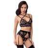 Комплект Abierta Fina, состоящий из бюстгальтера, пояса для чулок и стрингов без промежности, выполнен из эластичного черного кружева с бархатными деталями и аксессуарами в оттенке розового золота. Бюстгальтер удлиненного кроя имеет чашки с вырезами и небольшими застежками-крючками под атласными бантами, а также застежку-крючок на спине.