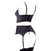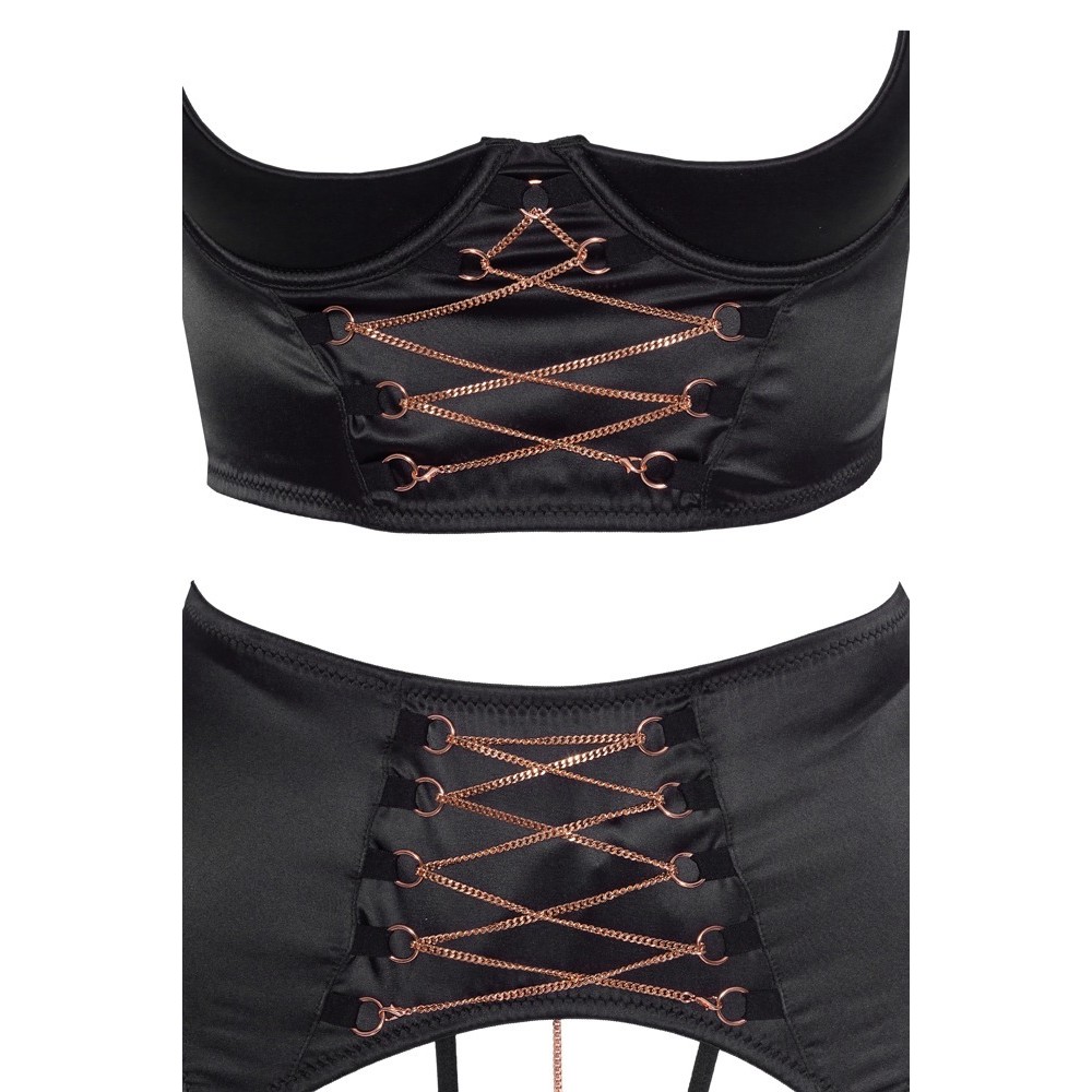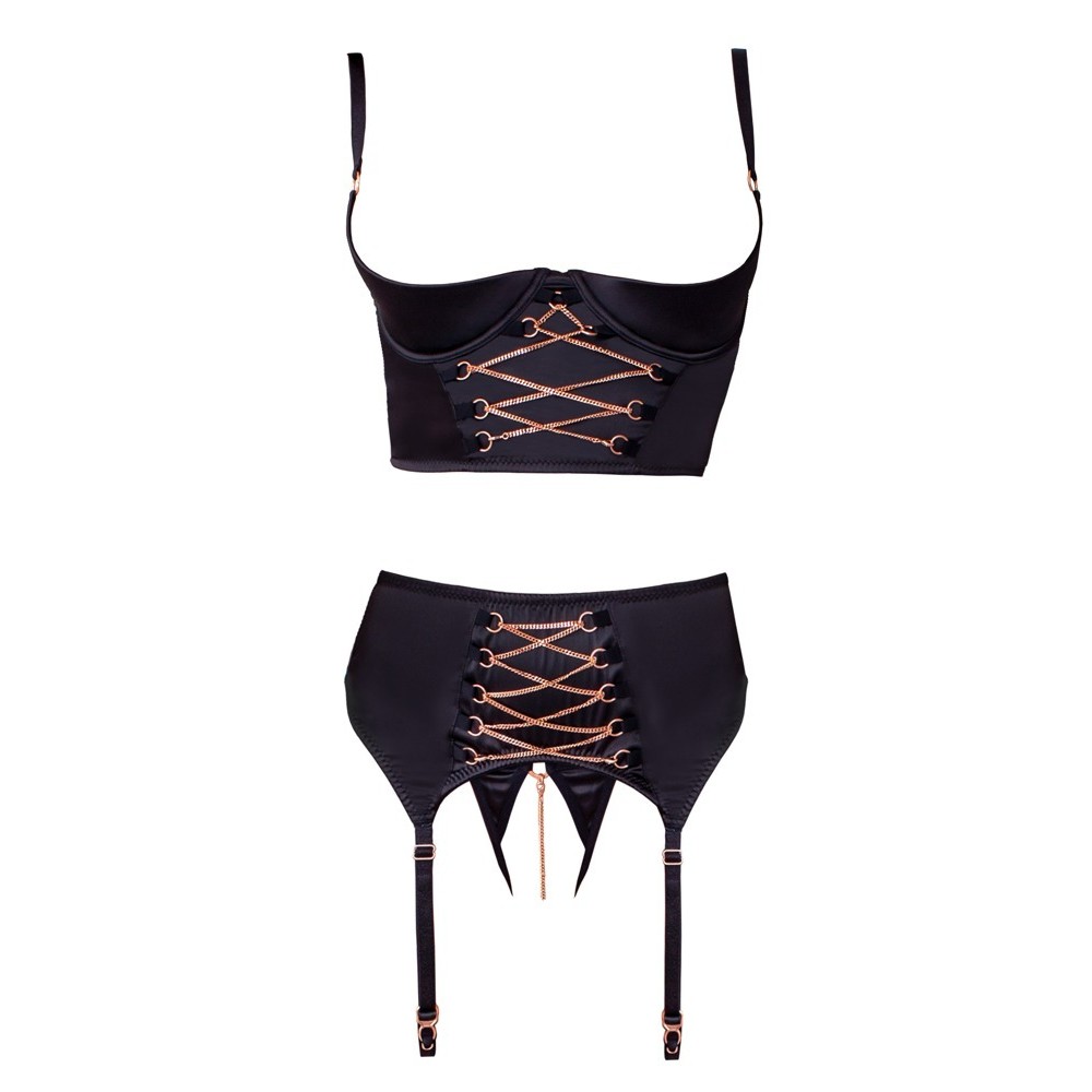 Комплект Abierta Fina состоит из слегка уплотнённого бюстгальтера с полочками, пояса для чулок и стрингов без промежности, выполненных из эластичного чёрного атласа с элегантными деталями в оттенке розового золота. Бюстгальтер с косточками имеет удлинённый крой, застежку-крючок на спине и регулируемые бретели. Широкий пояс для чулок также имеет застежку-крючок сзади и регулируемые ремешки. И бюстгальтер, и пояс украшены небольшими декоративными цепочками с эффектом бантика на передней части. Соответствующие стринги полностью без промежности и имеют съемную декоративную цепочку в области промежности.