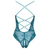 Боди без промежности от Cottelli LINGERIE, полностью из мягкого кружева синего цвета. Передняя и задняя части чрезвычайно сексуальны, с глубоким вырезом, соединены только декоративными кольцами из розового золота и эластичными ремешками. Область промежности привлекательно открыта. Бретели регулируются для идеальной посадки.
