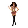 Плюшевый комплект из сеточки с подвязками и пластиковыми очками в стиле школьницы. Горловина халтер с прикрепленным клетчатым воротником с застежкой-липучкой на спине. Откровенное декольте с завязками на спине и юбочкой из клетчатой ткани. Открытая промежность, стринги сзади и прикрепленные/регулируемые подвязки. Бантики для волос и чулки в комплект не входят.