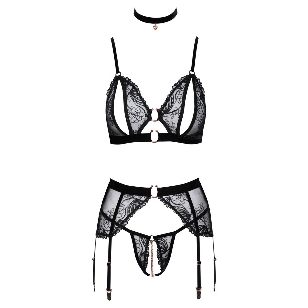 Элегантный и эротичный комплект от Abierta Fina, состоящий из бюстгальтера без косточек, пояса для чулков, стрингов без промежности и ожерелья из бархата. Изготовленный из нежного черного тюля с изысканной вышивкой и небольшими декоративными пайетками, он дополнен аксессуарами в оттенке розового золота и эластичными бретелями из бархата, которые подчеркивают его утонченный характер.