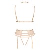 Классический комплект белья цвета нюд, состоящий из бюстгальтера, трусиков и пояса с подвязками.