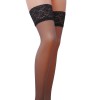 Эти самодержащиеся чулки сочетают в себе элегантность и смелость, выделяясь контрастным кружевом, которое создает изысканный и неотразимый визуальный эффект.